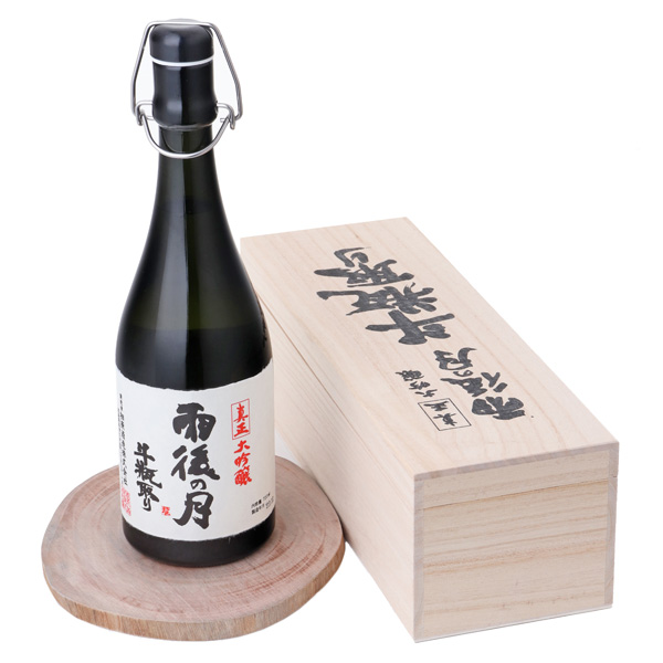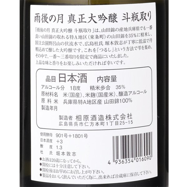 特A地区の山田錦を35%精米で醸した大吟醸です。昔ながらの酒袋にもろみを入れて、機械による圧力はかけずに、自然に滴るお酒を斗瓶取りにた手の込んだ贅沢な造りです。華麗で軽快、上質な甘み、エレガントな香りに滑らかな口当たりと、正に雨後の月最高峰、極みの逸品です。注意事項