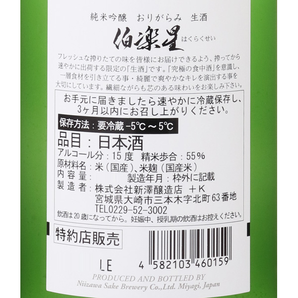 飲み疲れしない究極の3杯目を作ろう。創業1873年。2002年に宮城県最年少杜氏となった新澤巌夫社長を筆頭に、若き蔵人が集まる期待の蔵元です。 出荷管理には特に気を配り、しっかりと冷蔵管理のできる酒販店だけに販路を限定しており、全てのお酒は、生詰めで瓶燗火入れ、瓶貯蔵が行われ、酒質が少し若く、固い状態で出荷されます。 その理由は、流通の過程から消費者が口にするまでの時間経過を考えての事です。 究極の食中酒を意識し、一層食材を引き立てること、また、冷で爽やかな酸がいきてくるように造りに取り組んでいます。