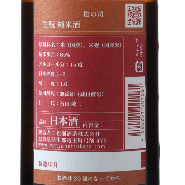 地下120Mの大きな岩盤の下を流れる鈴鹿山系愛知川伏流水を仕込み水とし、100%契約栽培により栽培法を定め十分に審査された酒米を、蔵人が時間をかけて精米。酒に味わいをつける箱麹法による麹造りや、酒質を決める社内保存酵母菌による速醸酒母と、昔ながらの生もと酒母の採用。また、発酵温度を低温に抑えながらも完全発酵を目指す小仕込み(1.2t以下)によるモロミ工程、そして瓶詰貯蔵による低温熟成管理(5℃以下)など、永年の経験による出来る限り丁寧な手造りで、深遠な味わいの「松の司」を醸しだします。(松瀬酒造HPより)
