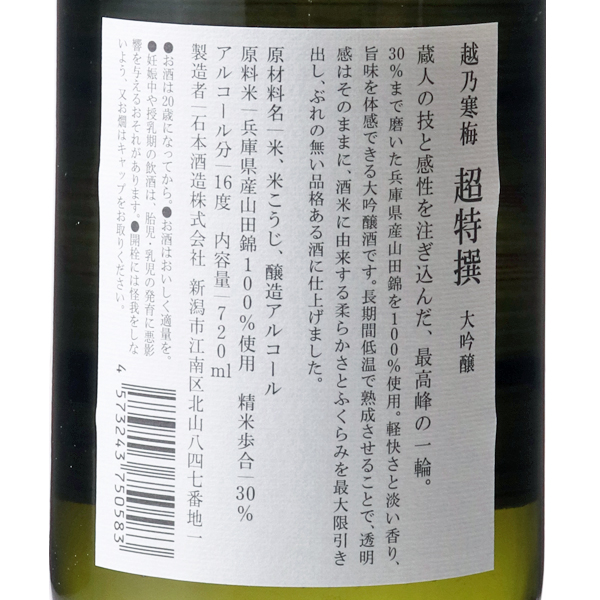 「あー、旨かった」、その一言のために明治40年、1907年に新潟市のほぼ中央に位置する亀田郷にて創業。亀田郷は、阿賀野川を水系とした豊富な良水、また低温環境を作り出す冬の雪に恵まれた、まさに酒造りの好適地といえます。 そんな石本酒造が目指す酒とは、淡麗でありながら、米本来の旨さを感じられる酒です。料理の味わいを引き立てる酒として、食前から食後まで飲み飽きせずにお楽しみいただけます。代表銘柄「越乃寒梅」は新潟の淡麗辛口酒ブームの火付け役のブランドで、全国に日本酒王国新潟のイメージを広めた功績があります。