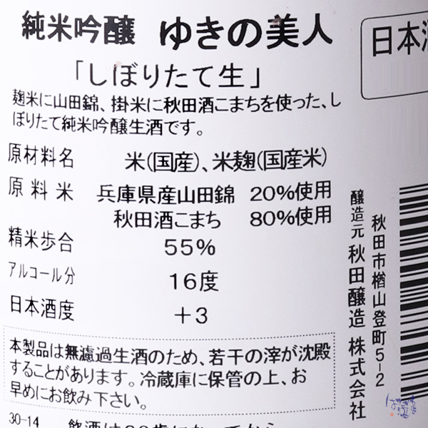 秋田県内でも屈指の軟水である、秋田市太平山麓の湧き水を仕込み水として使用しています。水源は山深い場所にあり、往復2時間かかります。熊に遭遇することもしばしばあり、まさに命がけの酒造り。フレッシュさと酸味の特徴的な味わいはゆきの美人でしか味わえません。