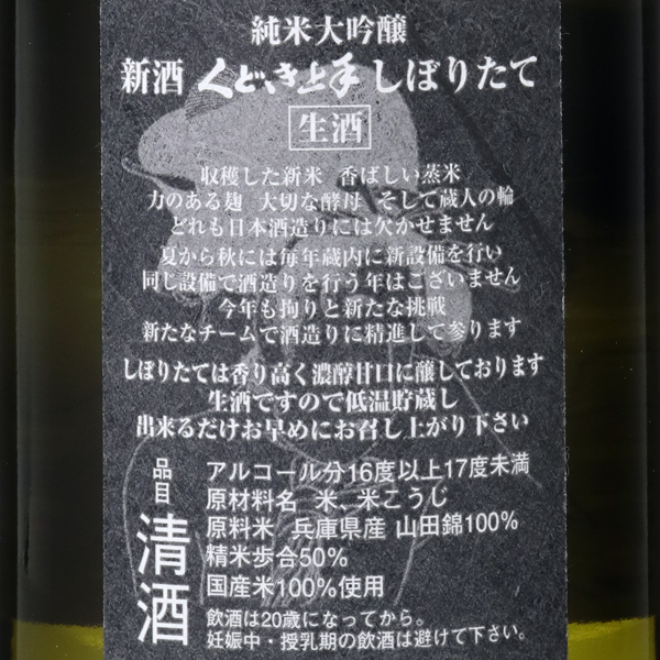 くどき上手から待望のしぼりたてが入荷!兵庫県産山田錦を使用したお酒です。くどき上手らしい華やかな吟醸香が広がり、口に含む前から期待が高まります。山田錦の上質な旨味をしっかりと引出した新酒は、ジューシーな甘味と旨味がみずみずしい質感の中に感じられて非常に満足度の高い味わいに仕上がっています。新酒ならではのリッチなテイストをお楽しみください。*イメージ画像と瓶色が異なる場合がございます、予めご了承ください。
