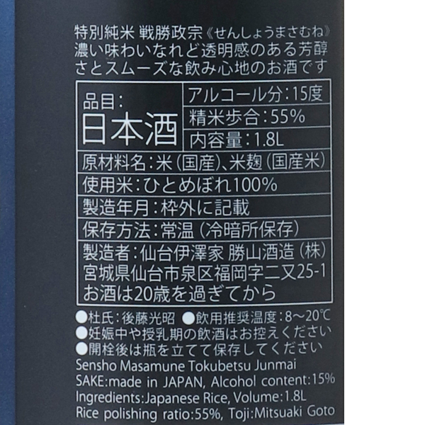 仙台で現存する唯一の伊達家御用蔵元禄元年、1688年に伊達政宗公を藩祖とする伊達家六十二万石の城下町仙台にて創業。その後、320年以上の間酒造りを続けている由緒ある酒蔵です。蔵のある地域は、お米を中心とした穀倉地帯で、泉ケ岳から湧き出る水は、勝山の仕込み水として深井戸より汲み上げ使用しています。水質は酒造りに適した軟水で、美人成分の天然シリカを多く含む、柔らかくキレイな水質となっています。勝山酒造のお酒は純米酒のみに特化しており、1週間にタンク1本の贅沢な仕込を行っています。様々な料理との相性が良く、多様な飲み方を楽しんで頂けます。