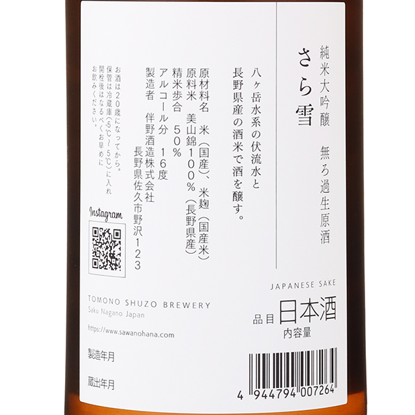 澤の花 さら雪 純米大吟醸 無濾過生原酒