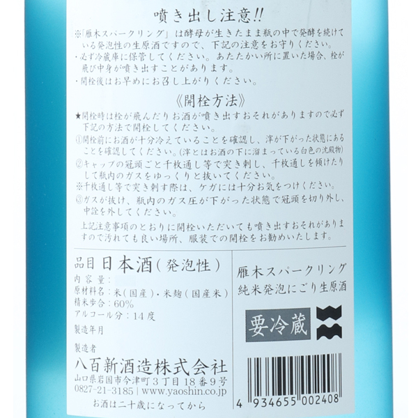 じっくりと瓶内発酵させたスパークリング日本酒です。きめ細かな発泡の中にも、雁木らしいしっかりとした山田錦の旨みを感じることができます。注意事項
