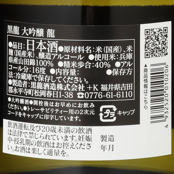 これまで少量で高品質な酒造りを追求しつづけ、まだ大吟醸の区分の無かった昭和50年には「龍」をリリース。全国に先駆けて大吟醸酒の市販化を成し遂げました。またこのお酒の誕生には、ワイン同様に日本酒を熟成できないかというテーマの追求がありました。「熟成」は搾った後の酒質に最も影響を与える要因です。黒龍酒造では原酒冷蔵貯蔵庫、低温・氷温貯蔵庫などの冷蔵設備によって、熟成純米大吟醸の最高峰である「石田屋」をはじめ、商品ごとに最適な温度管理を行っています。そうして1本1本、丁寧に仕上げられたお酒は、きちんと店舗での品質管理が出来る特約酒販店のみで販売されています。