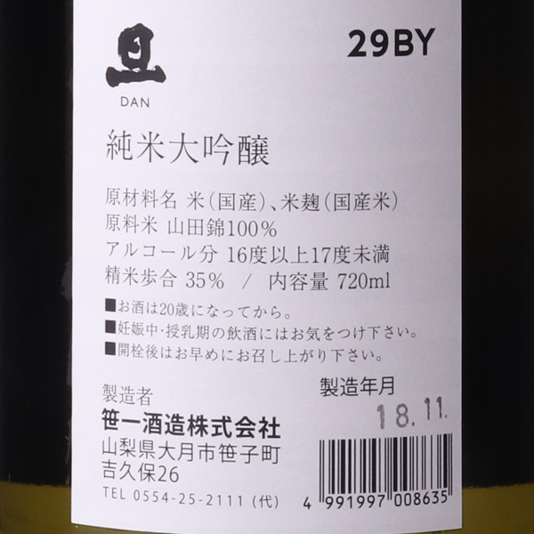 純粋な味を表現する旦シリーズ。山田錦35%精米を使用した純米大吟醸です。深みのある香りに、しっかりとした飲みごたえを感じる1本です。注意事項