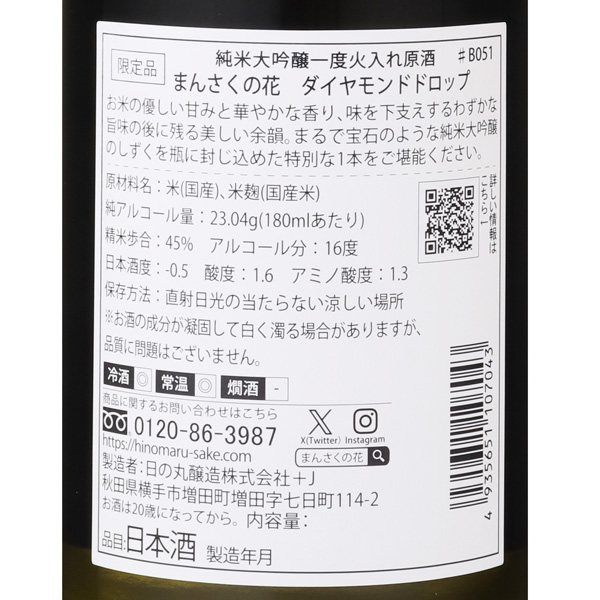 呑み手も、造り手も、みんなたのしく元禄2年(1689)創業。日の丸醸造では呑み手、造り手共に様々な発見や驚きと出会える様、毎年酒米や酵母が異なるお酒を50種類以上醸しています。完成したお酒はブレンドすることなく、そのまま瓶に詰め、生原酒もしくは一度火入れ原酒として販売を行っています。「酒質はもちろん、見た目にも愉しい」を心掛け、ラベルにも力を入れています。オリジナリティ溢れるラベルは蔵人が完成した酒を飲みつつ、議論をし、愉しみながら考案されています。