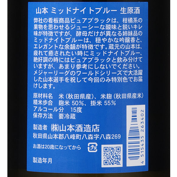 メジャーリーグのワールドシリーズで大活躍した山本選手を祝して、今回のみ特別色でお届け!ピュアブラックの姉妹商品。使用する酒米や精米歩合、麹菌等は同様で、酵母違いです。ピュアブラックは、秋田酵母No.12号、ミッドナイトブルーはこまち酵母R-5という秋田県開発の酵母を使用しています。香り控えめで、柑橘系のフルーツのようなジューシーな酸味とキレが特徴のピュアブラックに対して、上立つリッチな香りと、穏やかな味わいが特徴です。