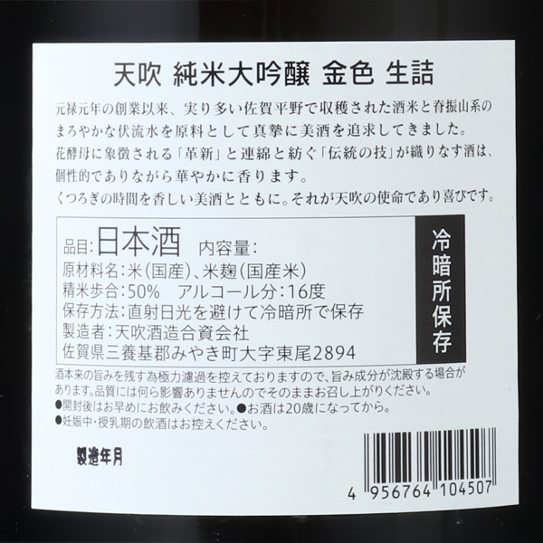 この酒「旨いね〜」のために元禄年間(1688年〜1704年)創業。300年の歴史を持つ天吹酒造は、みのり豊かな佐賀平野で収穫された酒米と背振山系のまろやかな伏流水を原料としています。農薬、除草剤、化学肥料を一切使わない合鴨農法で作った安全な良米、脊振山から流れ出る良水、酒造りに欠かせない豊かな気候。そして花からの贈り物、花酵母。これらの自然の恵みを活かし、独自の製法で造る天吹は花酵母の華やかな薫りとお米本来の絶妙な旨味を麹のチカラで引き出し、お客様へ美味しさと共に安心をお届けいたします。永い歴史の中で蓄積された技を引き継いだ蔵人達が、自然界の力に魅せられて、真摯に美酒造りを追求しています。