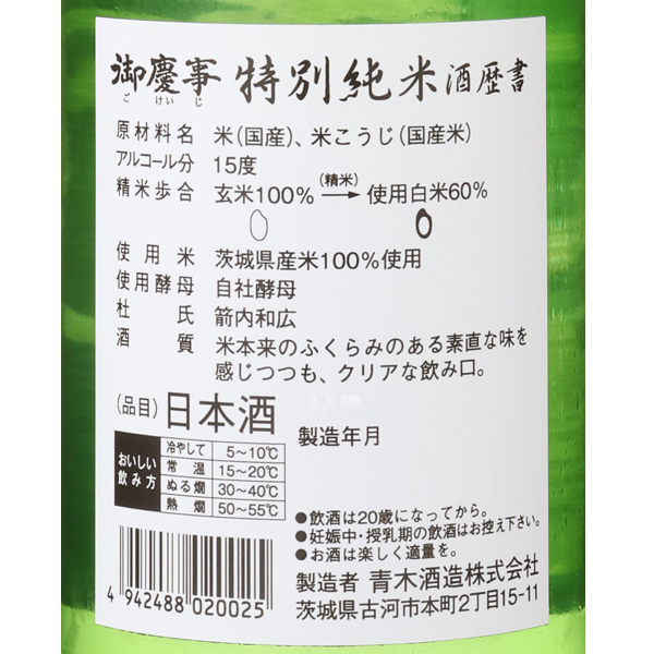 喜びのお酒を造る1831年、天保2年に創業。蔵人の高齢化が進む昨今、青木酒造では7代目当主が蔵の改革を遂行。2013年に新しく迎えた南部杜氏の箭内和広氏に酒造りの命運を託す形で舵を切りました。瞬く間に国内外のコンテストで最高賞やゴールドメダルを獲得するなど、他が目を見張るほどの成績を収めます。また看護師として働いていた7代目の娘、青木知佐氏も蔵に戻り、蔵元杜氏を目指して酒造りの研鑽を積みつつ「御慶事」を多くの世代に広める活動を行っています。酒造設備も大きく入れ替えられ、よりブラッシュアップされた「御慶事」は多くの人に喜びを与えています。