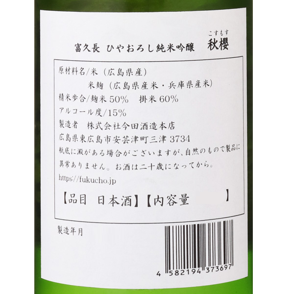 コスモスの和名は秋櫻。夏越しのひやおろしに秋の花を名付けました。富久長のひやおろしは、直汲みの原酒を1本ずつ丁寧に瓶火入れし、瓶貯蔵のままひと夏かけてゆっくりと寝かせています。酵母の特徴をいかしつつ、富久長らしい柔らかで華やかな風味はそのままに、果実のような香りとキレの良さが感じられる一本です。蔵紹介
