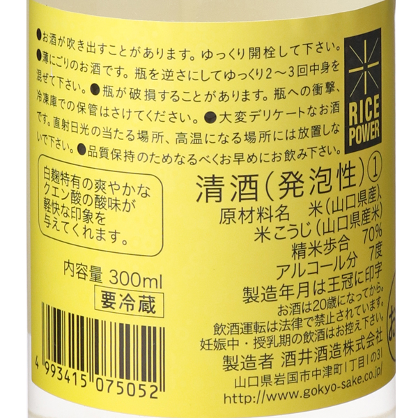 瓶内発酵による自然な炭酸ガスを封じ込めた発泡純米酒。白糀で仕込んだ限定バージョンの登場です!白麹由来のクエン酸でより爽快・軽快に。さわやかな果実味と酸味が心地よいサマーバージョンのねねです☆注意事項