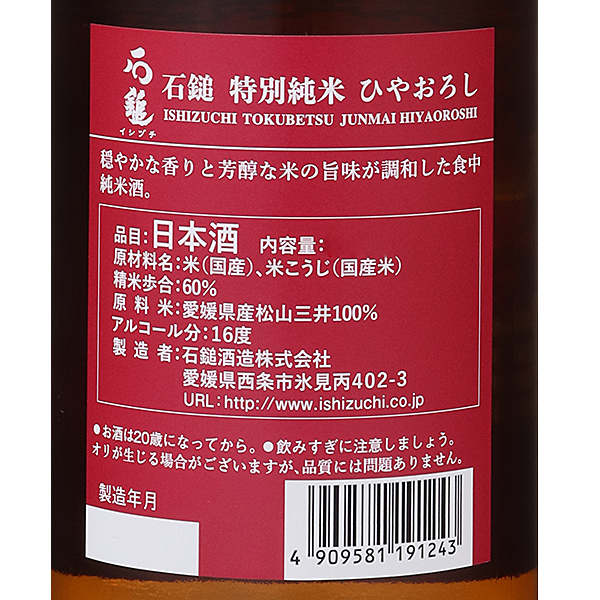 食中に活きる酒造り。大正9年、1920年創業。酒蔵の位置する愛媛県西条市は、西日本最高峰「石鎚山」のふところで名水の町として呼び名が高い地です。仕込み水にこの石鎚山系の清冽な水を使用、西条・周桑平野の穀蔵地帯を控えており、酒造りに非常に適した気候、風土の中にあります。平成11年に杜氏制を廃止し、「石鎚を愛して頂くお客様の為に造る」を蔵内のスローガンに掲げ、確実かつ丁寧な仕事をすることを信条に、社員全員が力を合わせて日本酒「石鎚」を醸しています。