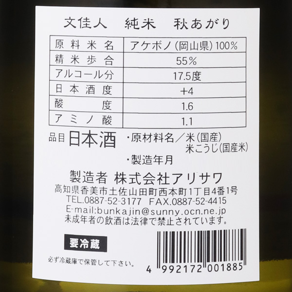 文佳人は、搾りたての酒がもつみずみずしい香りをそのまま味わってもらいたいという想いから、無濾過にこだわっています。さらに火入れ後マイナス5度の冷蔵貯蔵という徹底した管理がされています。清涼感のある飲み飽きしない味わいをぜひご堪能ください。