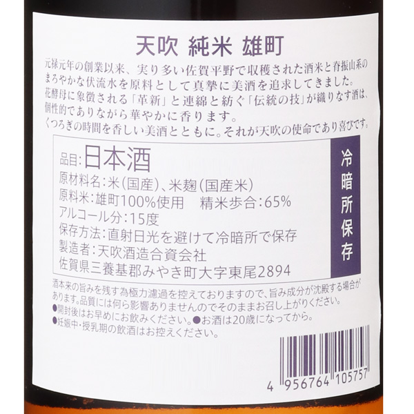 この酒「旨いね~」のために元禄年間(1688年~1704年)創業。300年の歴史を持つ天吹酒造は、みのり豊かな佐賀平野で収穫された酒米と背振山系のまろやかな伏流水を原料としています。農薬、除草剤、化学肥料を一切使わない合鴨農法で作った安全な良米、脊振山から流れ出る良水、酒造りに欠かせない豊かな気候。そして花からの贈り物、花酵母。これらの自然の恵みを活かし、独自の製法で造る天吹は花酵母の華やかな薫りとお米本来の絶妙な旨味を麹のチカラで引き出し、お客様へ美味しさと共に安心をお届けいたします。永い歴史の中で蓄積された技を引き継いだ蔵人達が、自然界の力に魅せられて、真摯に美酒造りを追求しています。