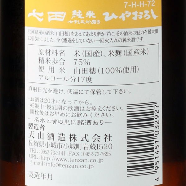 七田 純米 山田穂 七割五分磨き ひやおろし