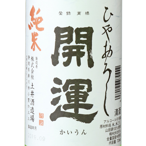 蔵伝統の技で、真摯に醸す、美しき酒土井酒造場は明治5年、1872年創業。田園に囲まれた山裾に建ち、高天神城の古戦場跡から湧き出る神秘の水と静岡酵母で醸す名酒「開運」の醸造元です。全国にその名を知られる全国新酒鑑評会常連蔵で、静岡県の日本酒を語る上では避けて通れない存在です。一世を風靡した静岡酵母の開発への貢献や、能登杜氏四天王のひとりに数えられる名人、故波瀬正吉氏が長年杜氏として指揮を執ってきたことでも有名です。そして土井社長は学究肌の蔵元であり、伝統技法を大事にする一方で最新の設備を使用、開発段階から参加した設備も数多くあり、酒造設備や醸造環境の改善に余念がありません。能登杜氏伝統の職人気質に最新の酒造設備で旨い酒を醸しています。