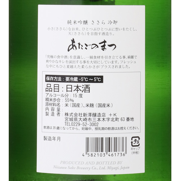 飲み疲れしない究極の3杯目を作ろう。創業1873年。2002年に宮城県最年少杜氏となった新澤巌夫社長を筆頭に、若き蔵人が集まる期待の蔵元です。 出荷管理には特に気を配り、しっかりと冷蔵管理のできる酒販店だけに販路を限定しており、全てのお酒は、生詰めで瓶燗火入れ、瓶貯蔵が行われ、酒質が少し若く、固い状態で出荷されます。 その理由は、流通の過程から消費者が口にするまでの時間経過を考えての事です。 究極の食中酒を意識し、一層食材を引き立てること、また、冷で爽やかな酸がいきてくるように造りに取り組んでいます。