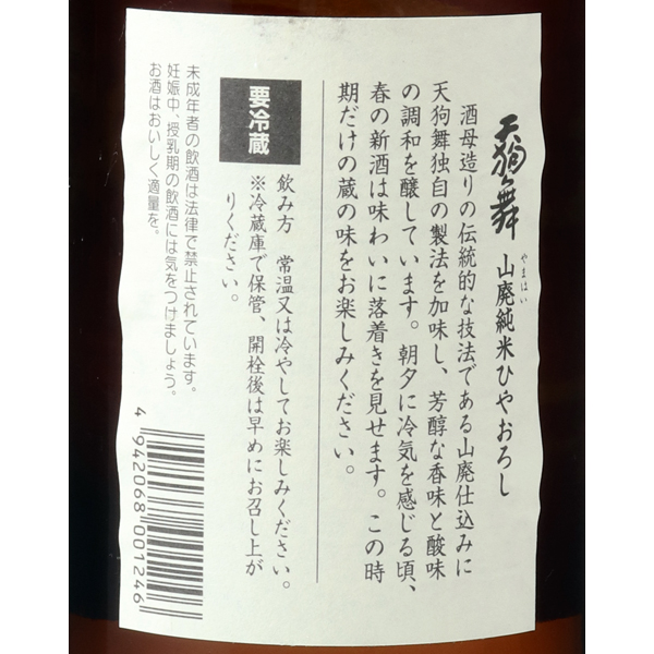 天狗舞の定番商品、山廃純米のひやおろし。冬に醸したお酒を秋口まで貯蔵熟成させたひやおろしは、丸みを帯びた深い味わいです。季節限定の味わいを?秋鮭の西京焼きや豚の角煮などと共にお楽しみください蔵紹介