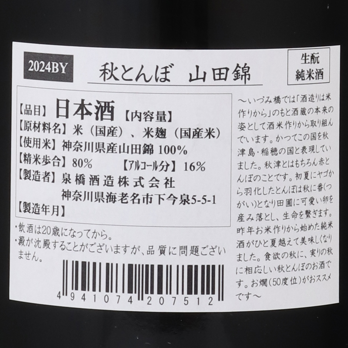 酒造りと米作り、どっちも本気です!…地元の田園風景を守る全量純米蔵泉橋酒造は江戸安政4年、1857年創業。県内有数の穀倉地帯である海老名耕地に蔵を構え、地元の農家と共に潤沢な米と丹沢山系の伏流水という2つの恵みを生かした酒造りを始めました。現在蔵で使用する酒米は9割以上が地元の契約栽培及び自社栽培米です。日本酒は醸造物であるだけではなく、農業副産物であると考え、米作りから酒造りを実践していく栽培醸造蔵としての歩みを進めています。無農薬や低肥料、冬期湛水など田んぼの健康を守り環境負荷を減らす栽培にも取り組んでいます。そんないづみ橋のお酒のラベルには自然環境に寄り添った農業を象徴する存在として、とんぼが蔵のシンボルとして度々登場します。太陽と大地の恵みをいっぱいに受けて育んだ信頼ある地元の米を丁寧に仕込む。海老名耕地の2000年を超える歴史と、自然の恵みを美味しいお酒で伝えていきます。