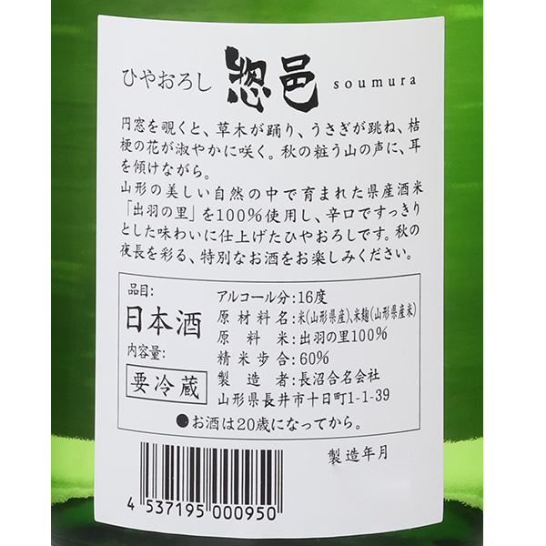 単なる食中酒で終わらない酒を目指して大正7年、1916年創業。長井市には、伝統文化を守り続ける職人達「手しごと衆・つくりと邑(むら)」がいます。その「つくりと邑(むら)」の心と、長沼合名会社の当主が代々受け継いできた「惣右衛門」の名をひとつにし、手造りの酒の心を託し、「惣邑」と命名されました。蔵が国の登録有形文化財に登録されている長沼では、自動圧搾機を使わず、旧来の手法を守り続けているのも魅力です。 香りが穏やかで、食事との相性が良い食中酒。そして飲み終えた人の心に響く酒を作ることを目標としています。