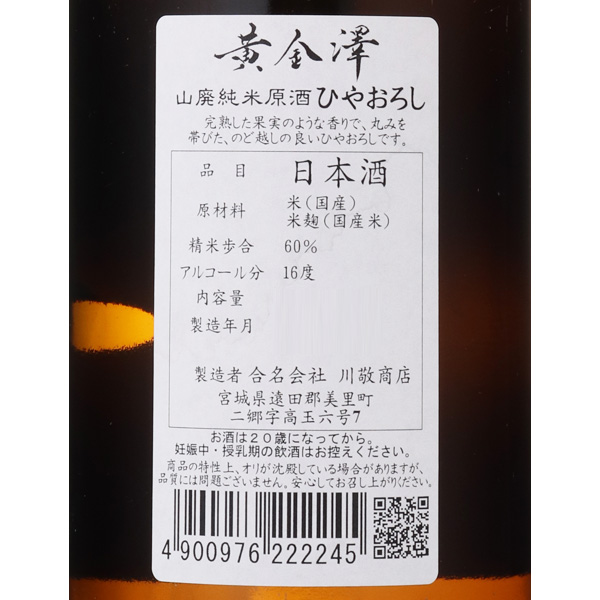 新酒鑑評会金賞常連の蔵を継いだ若き女性杜氏明治35年、1902年創業。全国新酒鑑評会にて県内でも群を抜く金賞受賞率を持つ酒蔵。一人娘として産まれた、川名由倫氏は2012年より父の指導を受けながら本格的に酒造りを開始。現在では蔵を継ぎ、「黄金澤」の代名詞ともいえる伝統の山廃仕込みを主体とした酒造りを行っています。女性ならではの感性で仕込まれたそのお酒は山廃仕込の武骨なイメージを覆す酒質で、口当たり軽やかで芯が通った味わいに仕上がっています。日々の経験を糧に発展を続ける酒蔵のお酒を是非お試しください。