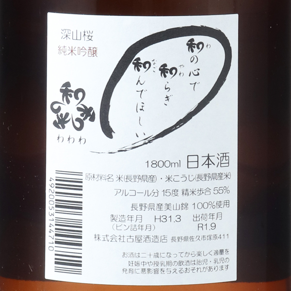「青葉まじりにみずみずしく咲く深山桜」とうたわれた酒蔵明治24年、1891年創業。皇女和宮の行列が歴史の道、中山道を往った頃、弁財天の森を後ろに抱いて「青葉まじりにみずみずしく咲く深山桜」とうたわれた酒蔵が生まれ、今に地酒を伝えています。限定流通の和「和和和」は(わ)の心で和(やわ)らぎ、和(なご)んでほしいという心で醸される特定名称酒のみで構成された銘柄です。非常に小さな酒蔵で、少量生産ですが、丁寧な手仕事により調和のある爽やかな日本酒を醸しています。