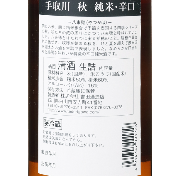 同じお米、同じ精米歩合で季節を表現する四季シリーズの秋。蔵のある辺りはかつて八束穂(やつかほ)の地と呼ばれていました。八束穂とはたわわに実る稲穂のこと。稲穂が黄金色に色づき、収穫が始まる秋を、ひと夏を越えて飲み頃を迎えたお酒を生詰で表現しています。口に含むと柔らかな味わいが口いっぱいに広がります。滑らかで綺麗な味わい、喉越しもスムーズでついつい杯が進みます。冷酒からやや室温に戻った位の温度が飲み頃です。蔵紹介