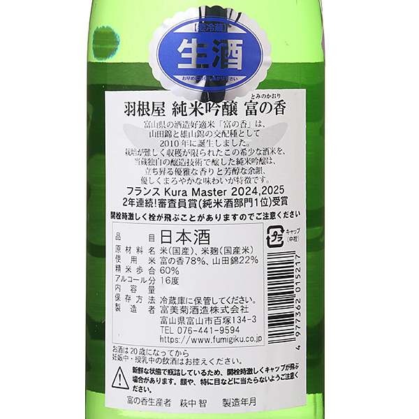 収量が非常に限られた希少な酒米、富の香(とみのかおり)は2010年に品種登録された富山県オリジナル酒造好適米。山田錦と雄山錦の交配種で、山田錦の優雅さと雄山錦の芳醇さを併せ持った、非常に魅力ある酒米です。麹米に山田錦、掛米に富の香を使用する事でより優雅な佇まいを表現しています。上品な余韻と優しいまろやかな旨味、心に染み入るような優しい味わいをお楽しみください。