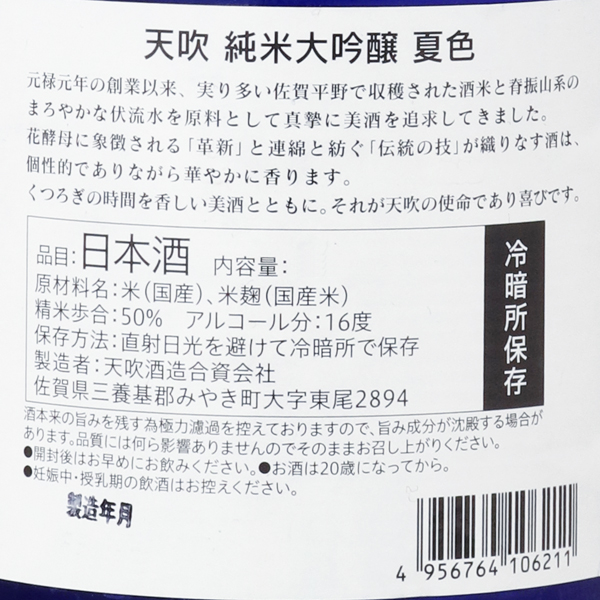 この酒「旨いね〜」のために元禄年間(1688年〜1704年)創業。300年の歴史を持つ天吹酒造は、みのり豊かな佐賀平野で収穫された酒米と背振山系のまろやかな伏流水を原料としています。農薬、除草剤、化学肥料を一切使わない合鴨農法で作った安全な良米、脊振山から流れ出る良水、酒造りに欠かせない豊かな気候。そして花からの贈り物、花酵母。これらの自然の恵みを活かし、独自の製法で造る天吹は花酵母の華やかな薫りとお米本来の絶妙な旨味を麹のチカラで引き出し、お客様へ美味しさと共に安心をお届けいたします。永い歴史の中で蓄積された技を引き継いだ蔵人達が、自然界の力に魅せられて、真摯に美酒造りを追求しています。