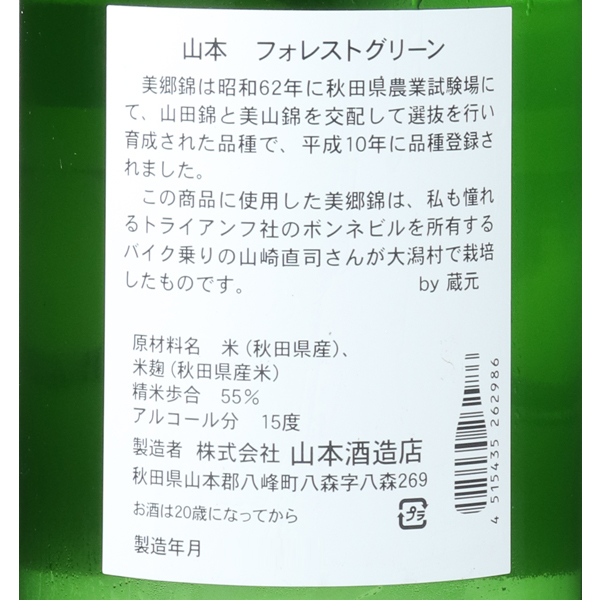美郷錦は山田錦と美山錦を掛け合わせた秋田県の酒造好適米です。秋田県内でも生産者が10名もいない貴重なお米です。青りんごの様なジューシーで爽やかな味わいの中に、はつらつとした酸が口いっぱいに広がり、スパッと切れのよい後味のお酒に仕上がっています。よく冷やしてお楽しみください。蔵紹介