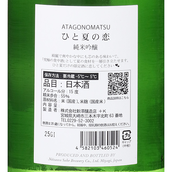 明るく、愛が溢れる世の中になるよう願いを込めて、ハートに蔵元の想いを乗せてハートがいっぱい散りばめられたお馴染みのハートラベル!バナナやメロンを思わせる穏やかな香りと、さわやかな酸、みずみずしく弾ける飲み心地の「愛宕の松」らしい夏酒です。糖度は低く、軽快でフレッシュな味わいは暑い夏にも疲れることなく杯が進み、食欲を刺激して相乗効果を生み出します。「究極の食中酒」による「究極の夏酒」を冷たく冷やして是非お楽しみください。受賞歴