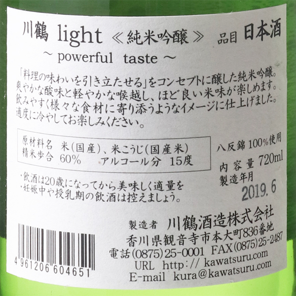 川の流れの如く、素直な気持ちで呑み手に感動を川鶴酒造は明治4年、1871年創業。蔵の裏に流れる清らかで豊富な水を湛える清流財田川に、鶴が舞い降りたことから初代蔵元が酒名を川鶴と命名しました。財田川は地元では別名「宝田川」とも呼ばれ、田に宝をもたらす水源とされています。螢が飛び交う財田川の地下伏流水と、讃岐平野の水田地帯で原料となる酒米、地元で収穫される魚介類や山菜などの料理とマッチするよう、出すぎず引きすぎずの関係を大切に、芳醇で旨味が最大限に引き出され、力強くて爽やかな、そして奥深く心地よい余韻が楽しめるお酒を醸しています。