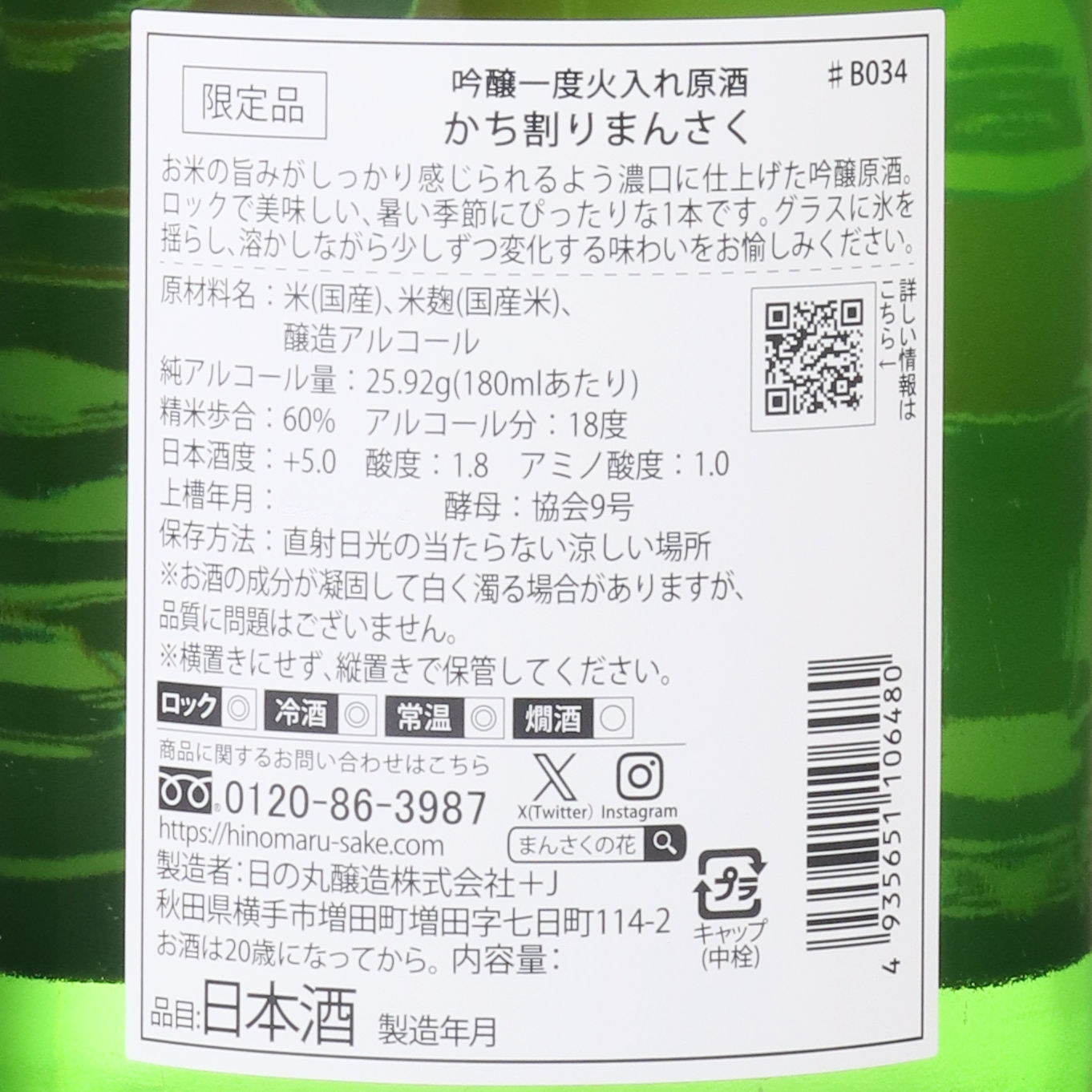 ロックで美味しい、まんさくの花の夏酒の代名詞「かち割りまんさく」。濃口ですが美味しい味わい、飲みごたえ十分、暑い夏でも爽やかに仕上がっています!穏やかで上品な吟醸香と上質な旨味をもち、アルコールの高さを感じさせないシャープで辛口な仕上がりとなっています。飲み口の良さからついつい飲みすぎてしまうかもしれませんが、グラスの氷を揺らしながらゆっくりとお楽しみください。