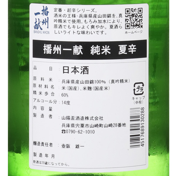 「播州一献」夏の定番辛口。贅沢に酒米の王様、兵庫県産 山田錦を真吟精米(米の厚さ方向を削ることで、タンパク質を効率よく削ることが可能な精米方法)で使用しています。暑い日にさっぱりと飲んでいただくために、原酒でアルコール度数14度に仕上げたライトでドライなタイプです。夏の食材、鰻とも相性がよく、脂がのってこってりとしたお料理もさっぱりと流してくれるキレが特徴。キレの良い爽やかさをご堪能下さい。蔵紹介