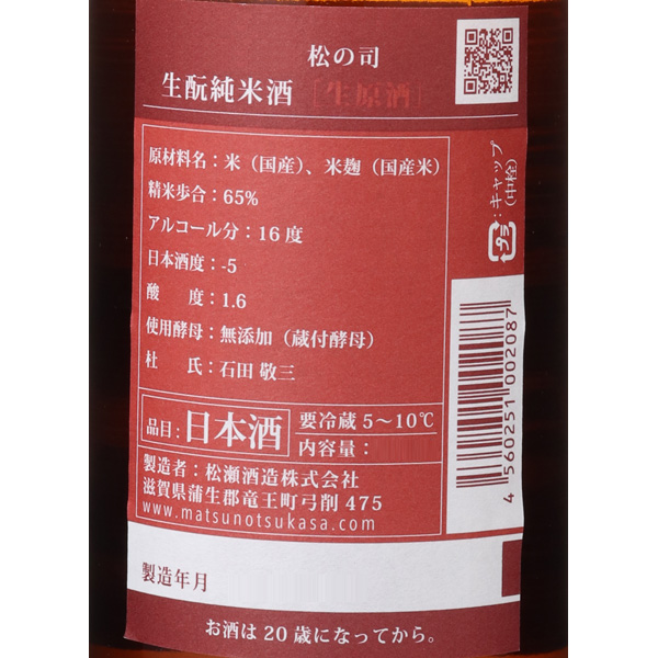 地下120Mの大きな岩盤の下を流れる鈴鹿山系愛知川伏流水を仕込み水とし、100%契約栽培により栽培法を定め十分に審査された酒米を、蔵人が時間をかけて精米。酒に味わいをつける箱麹法による麹造りや、酒質を決める社内保存酵母菌による速醸酒母と、昔ながらの生もと酒母の採用。また、発酵温度を低温に抑えながらも完全発酵を目指す小仕込み(1.2t以下)によるモロミ工程、そして瓶詰貯蔵による低温熟成管理(5℃以下)など、永年の経験による出来る限り丁寧な手造りで、深遠な味わいの「松の司」を醸しだします。(松瀬酒造HPより)