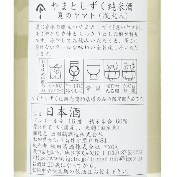 夏に香味の際立つやまとしずく 夏のヤマト。美山錦を原料米に、秋田流花酵母AK-1を使用し、あざやかな香味とくっきりとした酸が特徴です。上槽後速やかに瓶詰し、1回のみ火入れをする事でフレッシュ感豊かな味わいをキープしています。暑さに負けないクールな味わいをお楽しみください。蔵紹介