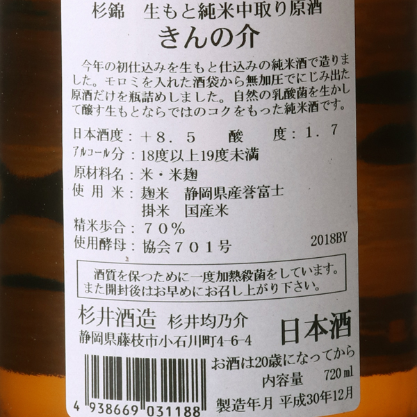 静岡県産誉富士主体に冷蔵庫内で醸した新酒。750Kgの小仕込で生もと造りにより丁寧に醸し、槽搾り、瓶火入れしました。杏や麹のはつらつとした香りと、しっかりとした酸によるキレ、ふくらみのある旨味が楽しめる味わいです。蔵紹介