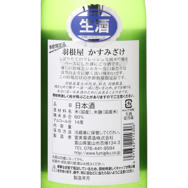 春の特別季節商品。しぼりたてのフレッシュな純米吟醸をベースにしたうすにごり酒です。羽根屋らしい透明感とシルキーな口当たりは淡雪のように柔らかく、優しい味わいになっています。淡雪の様に儚く淡く、春のうららかな日にお召し上がりいただくに最適な一本です。蔵紹介