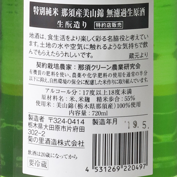穏やかな香り。甘味は控えめな酸味が印象的な口当たり。原酒らしくしっかりとしたボリューム感のある飲み口。美山錦55%精米を使用。蔵紹介
