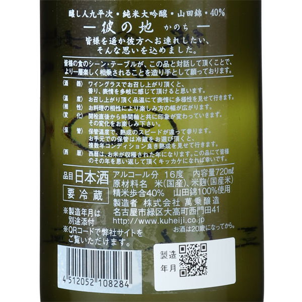 彼の地(かのち)は、皆様を遥か彼方へお連れしたい、そんな思いを込めて命名されました。山田錦40%精米の純米大吟醸です。洋ナシやイチゴ、アカシアの花の香り。果実味を強く感じますが、余韻に残る酸が心地よく、料理と合わせたいバランスの良さです。フレッシュな味わいの要素がギュッと詰まっているため、時間の経過と共に旨味が力強くなり、熟成するポテンシャルも感じていただける一品です。贈り物としてご購入のお客様へ
