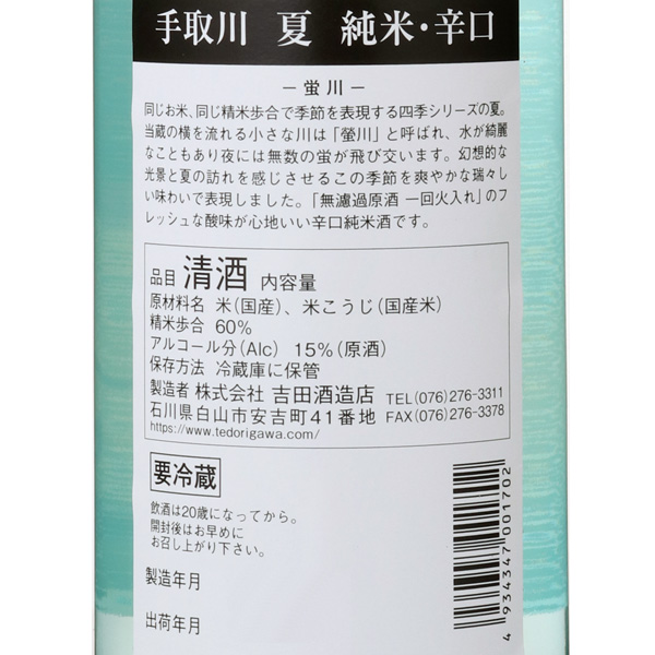 蔵の横を流れる小さな川は螢川と呼ばれ、水が綺麗な事もあり夜には無数の蛍が飛び交います。幻想的な光景と夏の訪れを感じさせるこの季節を爽やかに演出します。一口目はさらりとした喉ごしですが、二口目を口に運ぶと、芳醇な米の旨みが口中を占拠します。後味を引く旨さで、三口目、四口目と杯が進みます。10~15度の温度帯でワイングラスの様な大ぶりのグラスをおすすめします。蔵紹介