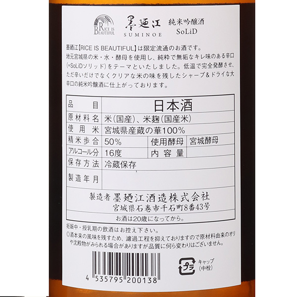 墨廼江 Rice is Beautifuシリーズ。宮城の米「蔵の華」・酵母・水で醸したオール宮城。純粋で無垢なキレ味ある辛口=SOLIDを、クリアな米の味わいで表現しています。食中に適し、清涼感ある香りでのど越しのキレ味は抜群。ただ辛いだけでなく、透明感のある旨味も感じます。蔵紹介