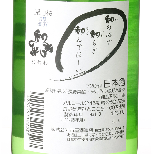 「青葉まじりにみずみずしく咲く深山桜」とうたわれた酒蔵明治24年、1891年創業。皇女和宮の行列が歴史の道、中山道を往った頃、弁財天の森を後ろに抱いて「青葉まじりにみずみずしく咲く深山桜」とうたわれた酒蔵が生まれ、今に地酒を伝えています。限定流通の和「和和和」は(わ)の心で和(やわ)らぎ、和(なご)んでほしいという心で醸される特定名称酒のみで構成された銘柄です。非常に小さな酒蔵で、少量生産ですが、丁寧な手仕事により調和のある爽やかな日本酒を醸しています。