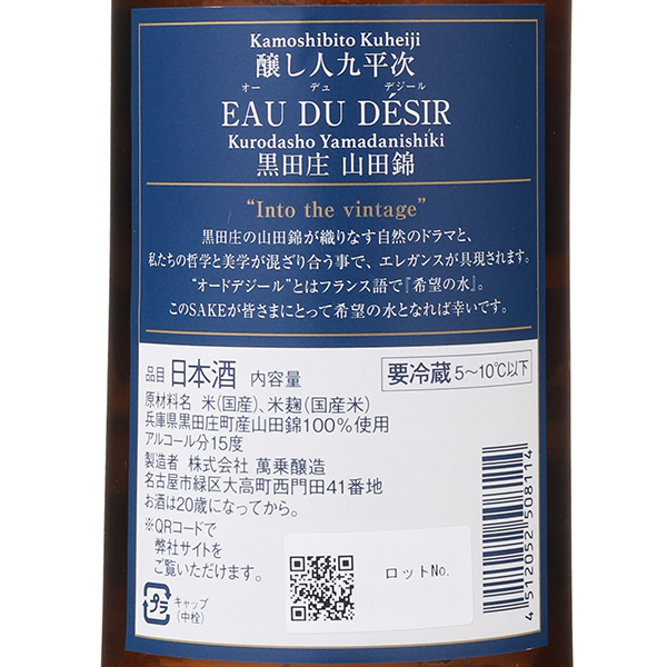 EAU DU DESIRとは「希望の水」という意味を持つ、醸し人九平次の代表銘柄。熟す直前の果実のニュアンスとエキゾチックなスパイスの香り、柑橘を少し絞ったような苦みのアクセント、味全体を下支えする酸味、幾重にも折り重なった味が余韻へと繋がります。取り扱ってくれている酒販店への恩返しのため、いつか世界の三ツ星レストランに醸し人九平次をオンリストさせてみせますと語り、2004年にフランスで実現。有言実行の本当に輝かしい造り手です。