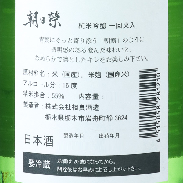 青葉にそっと寄り添う朝露のように透明感のある日本酒天保2年、1831年創業。現在では若くして蔵元杜氏となった相良沙奈恵氏を中心に酒造りが行われています。沙奈恵氏は東京農大卒業後、他の酒蔵で修業を積み、蔵に戻った翌年から杜氏の重責を担うことになりました。普通酒主体だった酒造りから吟醸造りへ大きく方向転換をし、日々研鑽を積む女性杜氏が醸すそのお酒は年々進化し続けています。代表銘柄「朝日榮」では、みずみずしい透明感と後味のキレが表現されており、食事にそっと寄り添ってくれるお酒です。