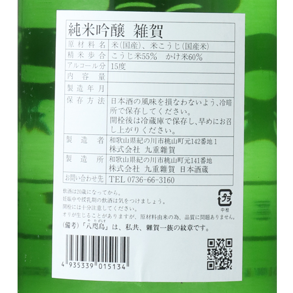 しっかりとした酸、旨味を意識した味わいで、雑賀らしい辛さが後引く食中酒です。麹米山田錦 、掛米五百万石で醸した純米吟醸酒。蔵紹介